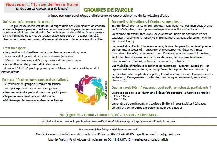 Lieu d’expression explorant une expérience collective et personnelle à la fois, le groupe de parole permet de s’interroger sur nos potentiels, nos acquis, nos possibilités de changement, de compréhension de l’autre et de soi à travers nos vécus croisés. Il n’y a pas de confrontation, pas de comparaison, l’expérience de chacun est unique. L’objet est plutôt de s’enrichir mutuellement, dans le respect de soi et de l’autre, dans la bienveillance.